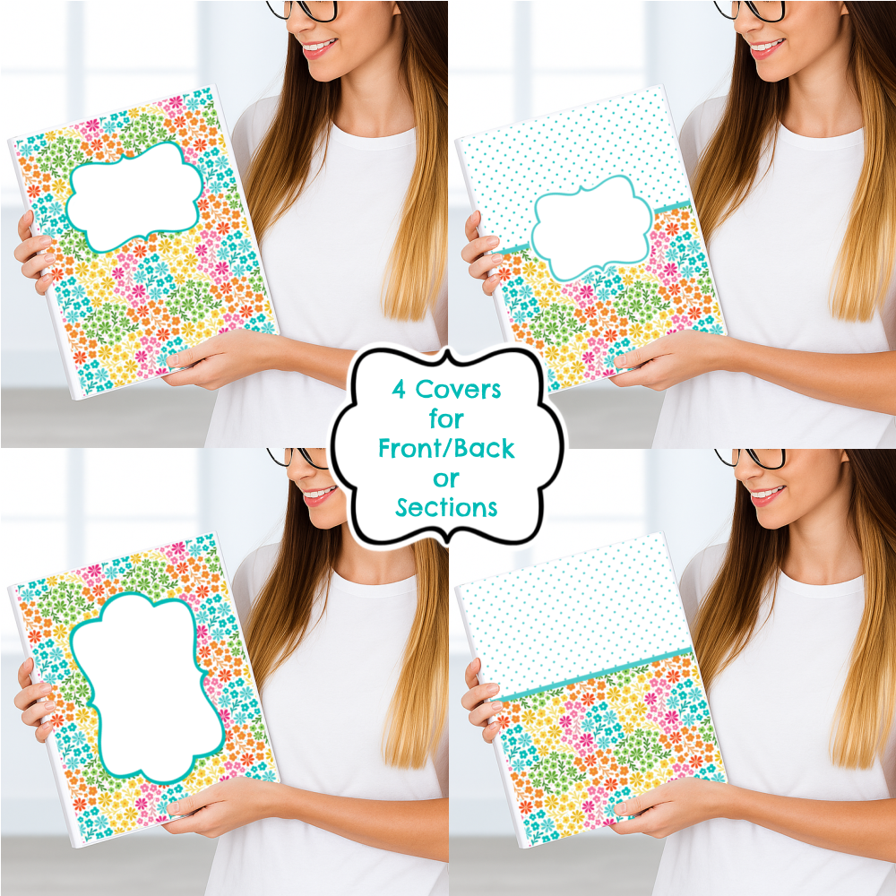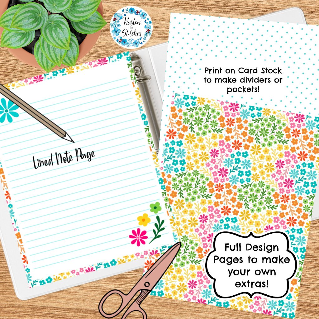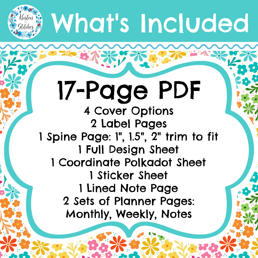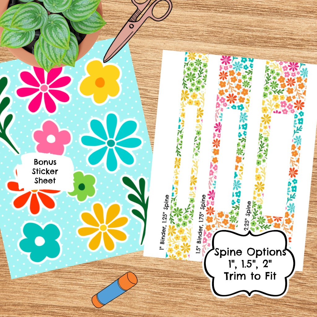 Printable Binder Covers and 17 Page Planner Set Stickers 8.5x11 PDF Spring Rainbow Flowers
