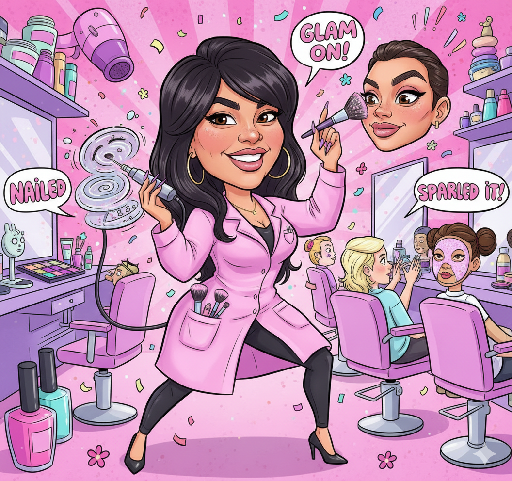 Central Figure: The character wears a pink lab coat and black leggings while multitasking with a nail drill and a makeup brush.
