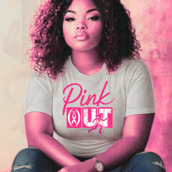 This bold Pink Out shirt design is perfect for Breast Cancer Awareness Month, Pink Out football games, charity events, or everyday wear to honor survivors and fighters. Featuring a grunge-style “OUT” text with runner silhouette and a pink ribbon, it’s empowering, sporty, and eye-catching.
