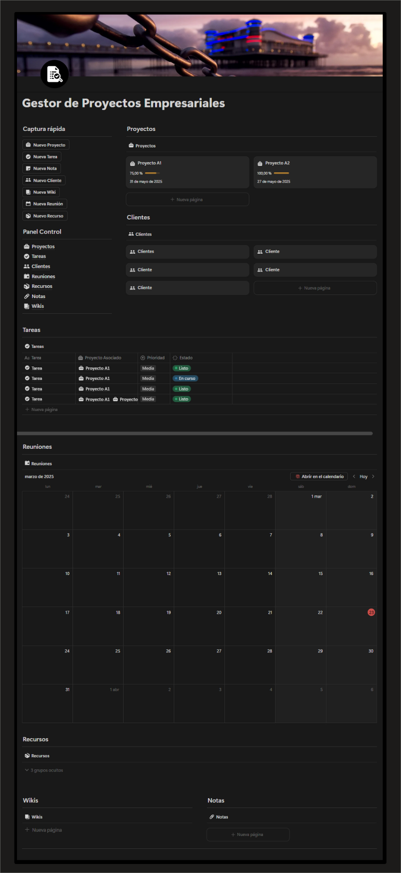 Optimiza la gestión de tus proyectos y mantén el control de cada detalle con nuestra plantilla "Gestor de Proyectos Empresariales" para Notion. Diseñada para empresarios, equipos y freelancers, esta herramienta te permite organizar, planificar y ejecutar proyectos de manera eficiente, asegurando una visión clara de cada proceso.