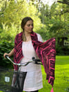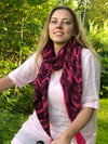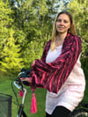 Metatassels can be worn as a wrap around the shoulders or like a scarf. The shawl is knitted from one point to the other, and it’s easier than it looks! Use a single contrast colour or vary the colour of the stripes to fit your personality. A little variation to the stripes is brought by elongated stitches creating ‘knuckles’ on the stripes.’