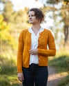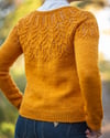 This cardigan features a delicate circular lace pattern yoke. Short row shaping is used to shape the neck. There is no waist shaping in the pattern, however some waist shaping can be easily added. Sleeves are shaped with decreases. The length of the sweater can be modified since the cardigan is worked from the top down.