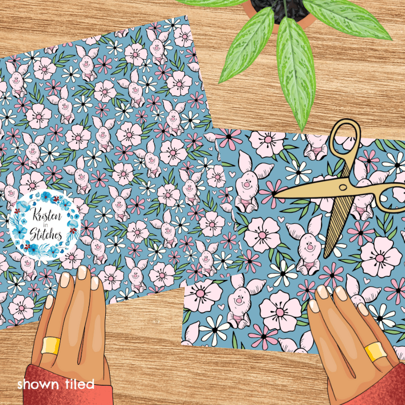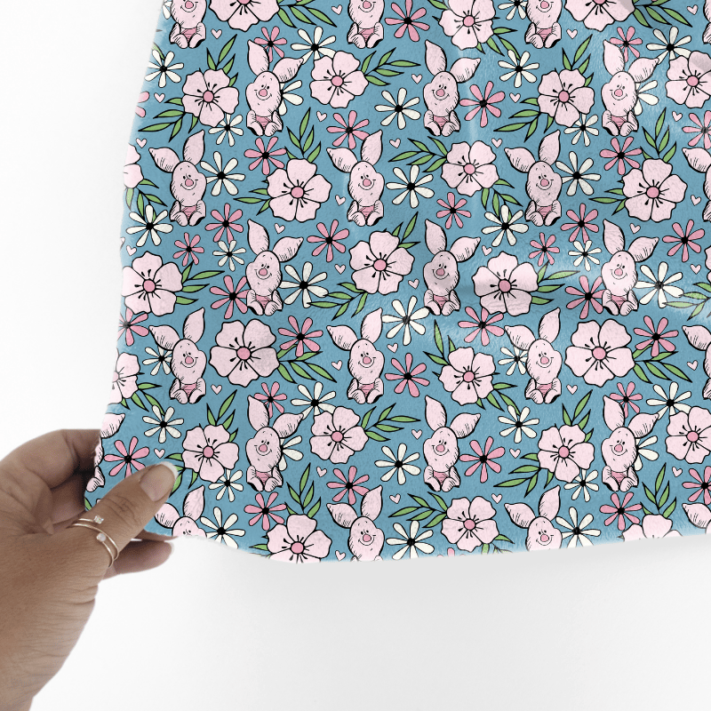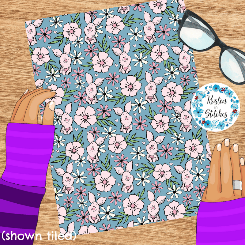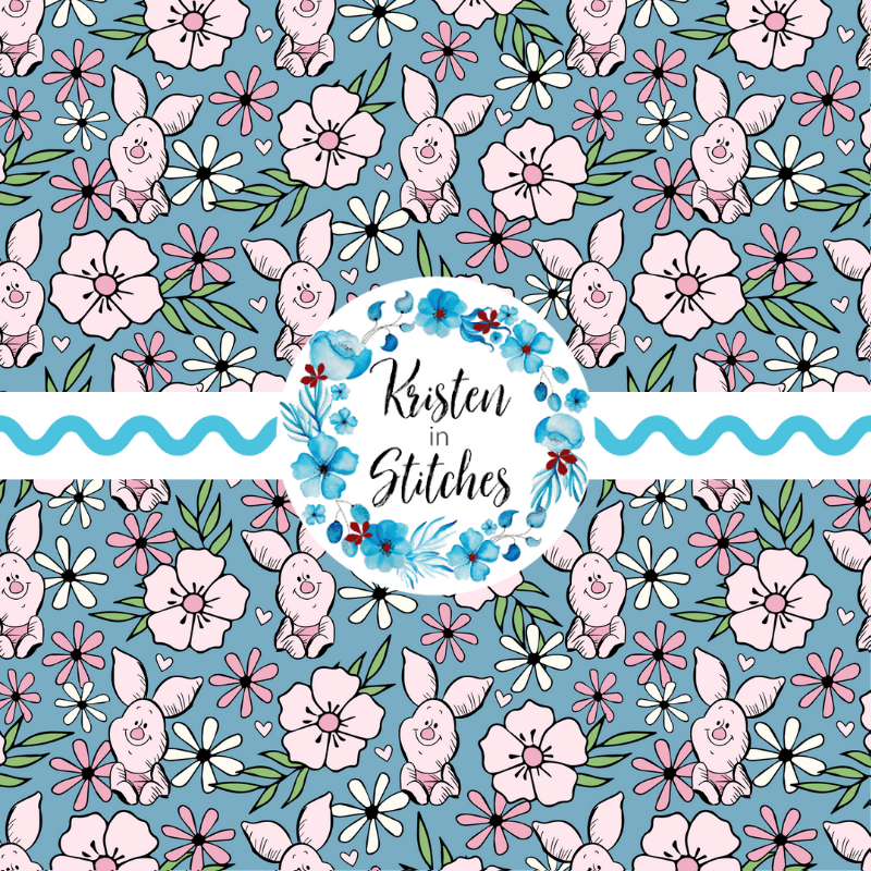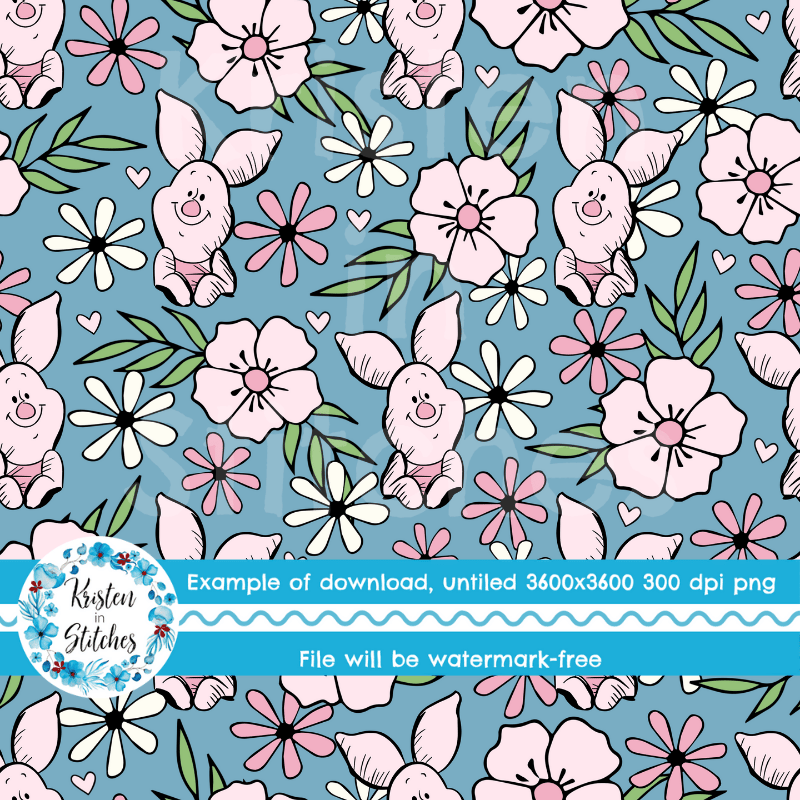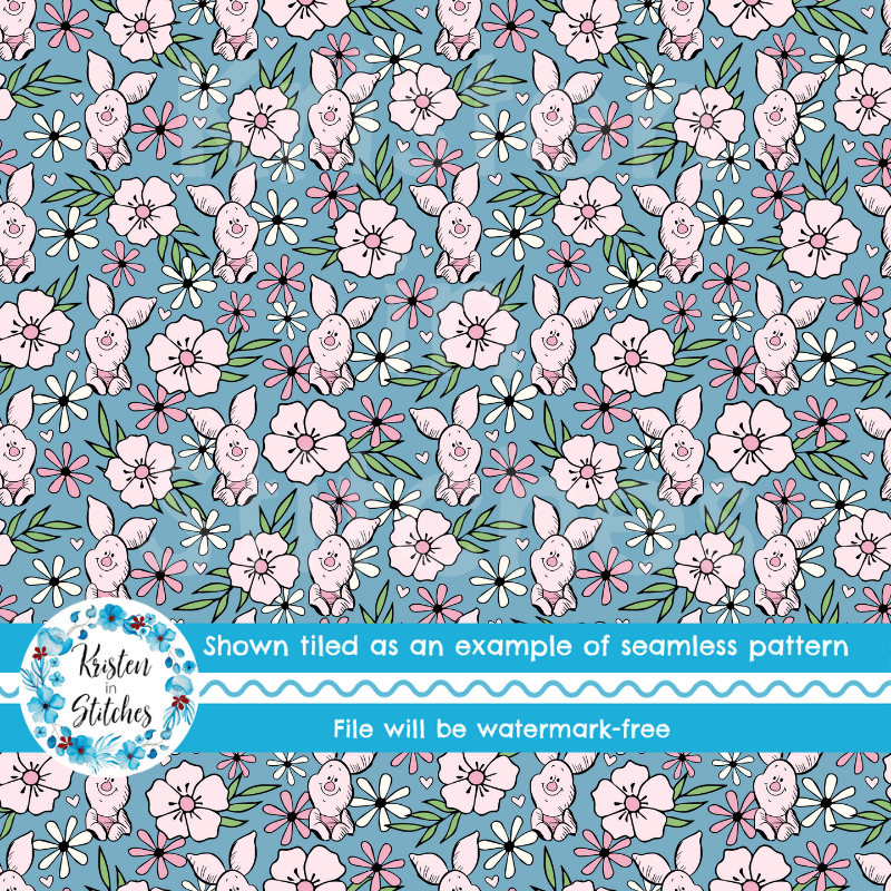 Piglet Floral Seamless Pattern, Classic Winnie the Pooh Nursery, Vintage Blue