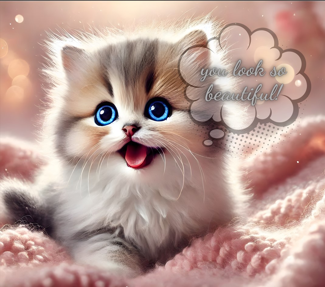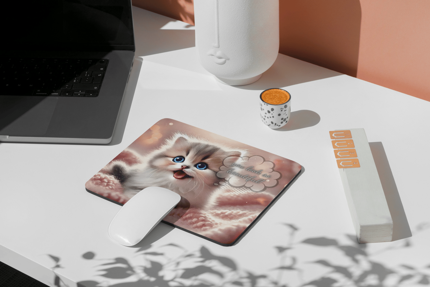 Transform any ordinary mouse pad into a work of art with this high-quality sublimation design file featuring an irresistibly adorable kitten and the uplifting message: "You look so beautiful!" Whether you’re crafting for yourself or creating physical products to sell, this design will captivate cat lovers and brighten anyone’s day.
