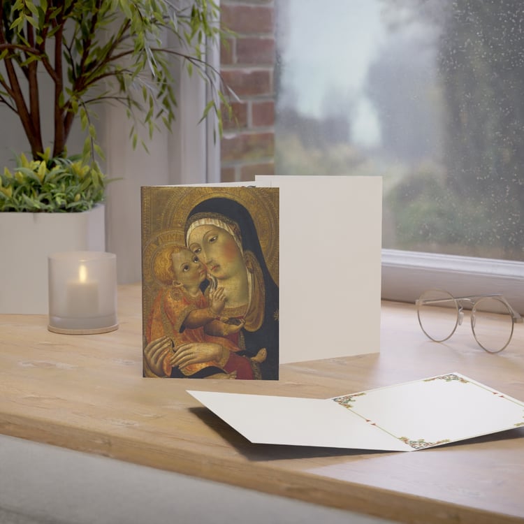 A set of five Christmas cards, beautifully printed with a high resolution image of this enchanting late 15th century Early Netherlandish painting of the Virgin and Child by the unknown painter known to us today as the "Master of the Embroidered Foliage".