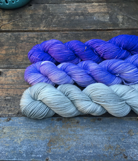 Pink/grey cowl at left: Kit from Lady Dye Yarns