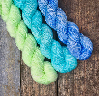 Blue/Green Cowl: Gigi Bonin Hand Dyed Yarns (200 yard minis): Color A: Honeydew, Color B: Sky Aire, Color C: It has Sprung