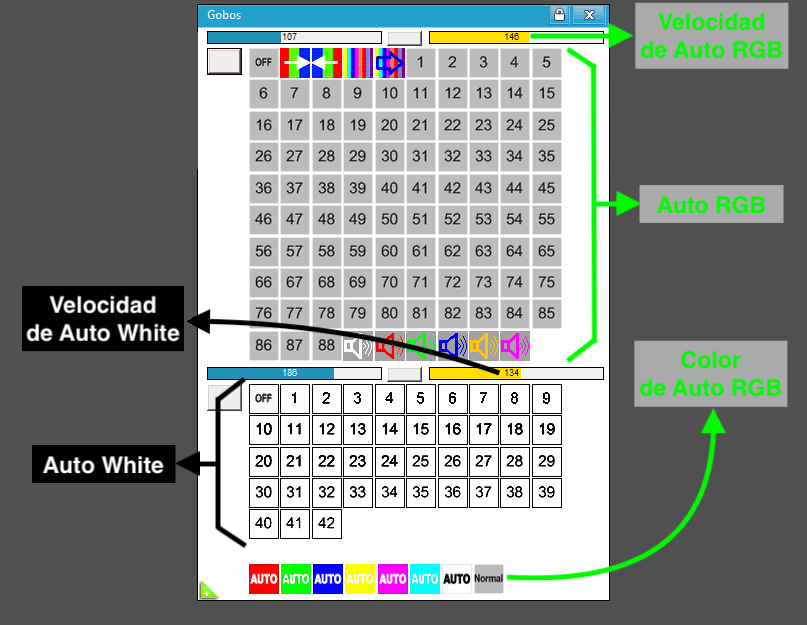 • Automáticos de Colores RGB, con velocidad y color de fondo.