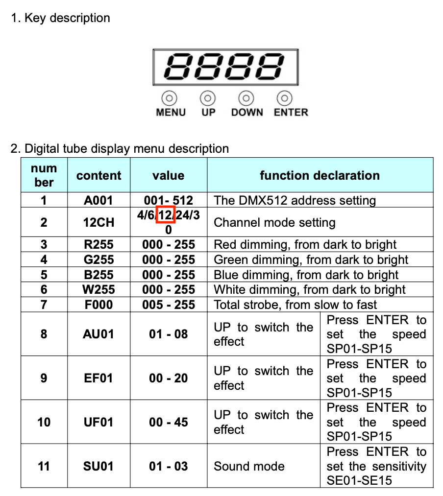 * Verifique, en el display del equipo, que muestre los modos dmx: 4CH, 6CH, 12CH, 24CH y 30CH (ni más ni menos).