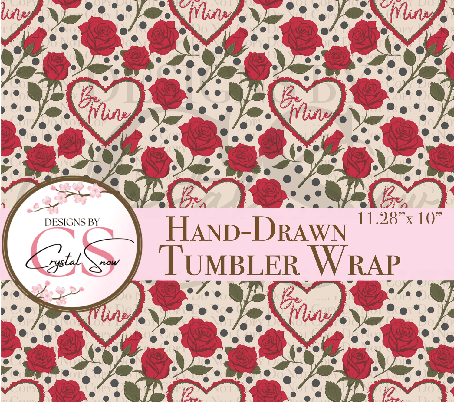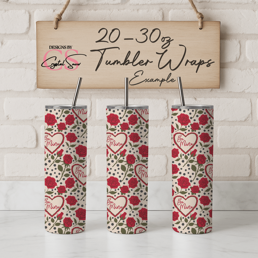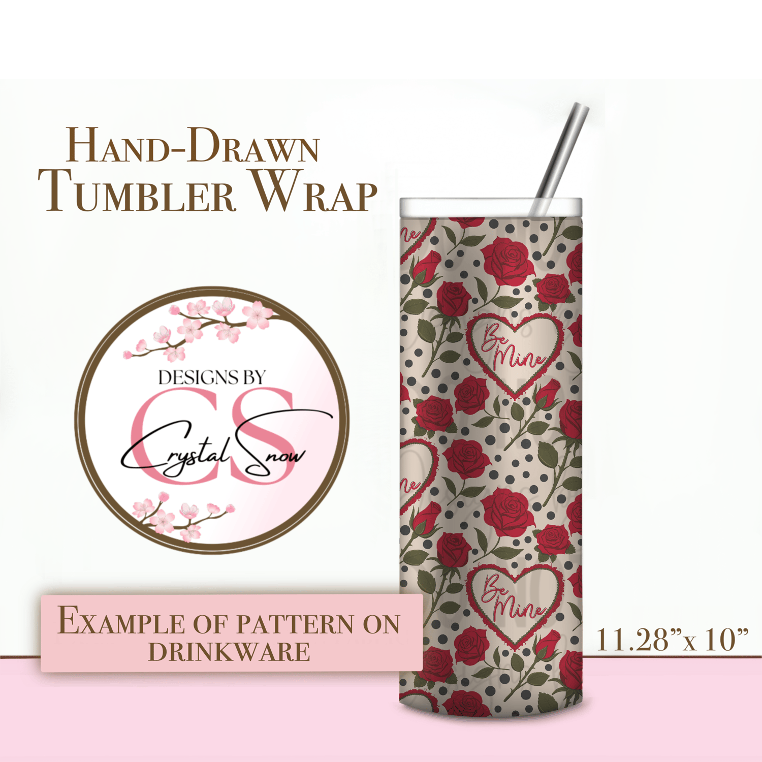 Roses Be Mine is a hand-drawn tumbler wrap featuring classic red roses, soft polka dots, and stitched heart accents with “Be Mine” lettering. Designed to wrap cleanly around a 20oz/30oz skinny tumbler, this file gives a polished, professional look with zero fuss.