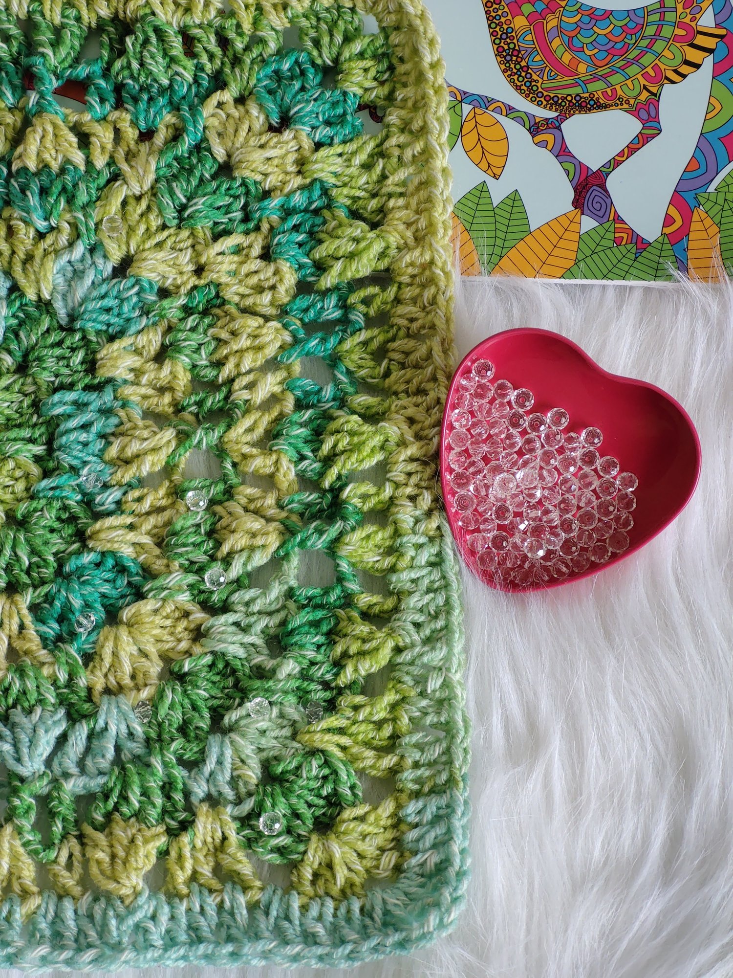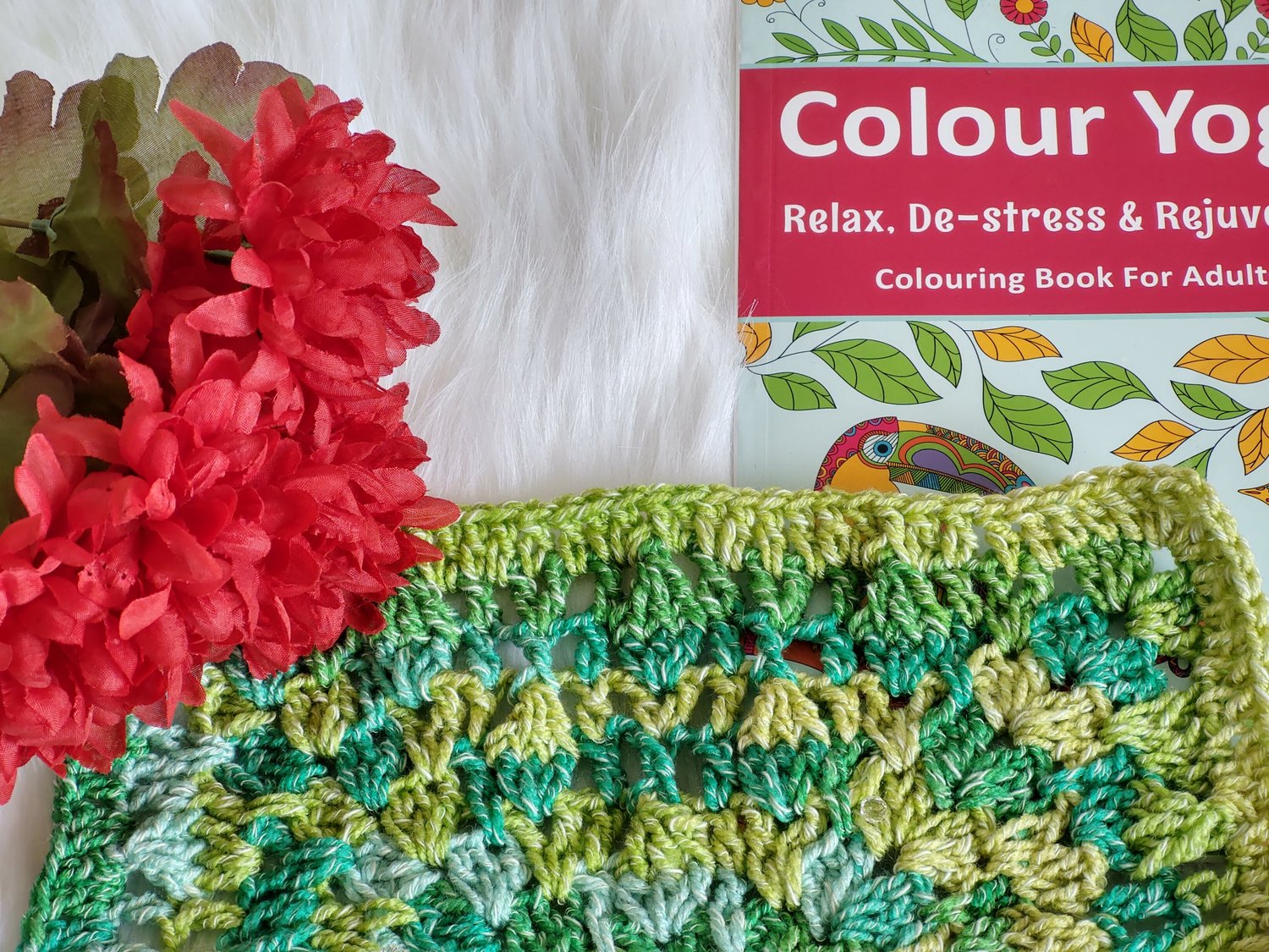 Have you noticed how fresh your plants look after the rains? We just love to watch the plants soaking up all the rain! When they sway back and forth, it seems like they are having such a party!! This square is named Thulir as we see new buds, new shoots come up after a good rainy season! The landscape just changes to a vibrant green. This square uses Vstitch in one round, dc in another and front post dc decrease to get the look of a leaf. The last square in the prototype was made with Lion Brand cotton blend and though it was marked as CYC3 it feels like a CYC 4 and hence turned out to be heavier than the rest. Having said that, it did not make difference to the whole throw/blanket. This square held its shape while making and fits like a glove into the whole blanket.