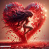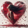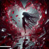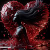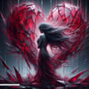 Amid the shards of a shattered crimson heart, she stands—her long, flowing hair cascading like whispers of a love once whole. Suspended in the wreckage of passion and pain, the fractured glass reflects both her strength and vulnerability, a haunting echo of what was and what remains.