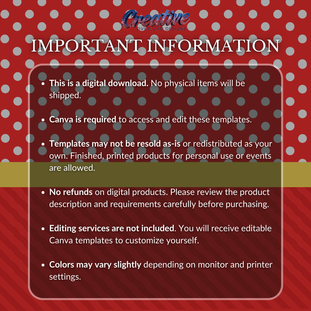 Templates may not be resold as-is or redistributed as your own. Finished, printed products for personal use or events are allowed.