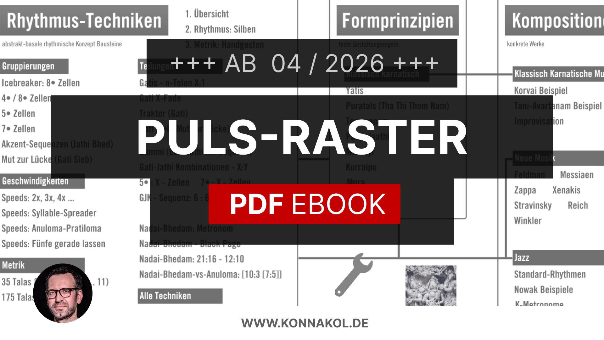 In dem E-Book "Puls-Raster - Teil 1" präsentiert der Neue Musik Komponist und Netzwerk Konnakol.de Co-Initiator Johannes Winkler verschiedene Vorgehensweisen, um sich komplexe Puls-Raster und rhythmische Gruppierungen zurechtzulegen.