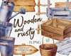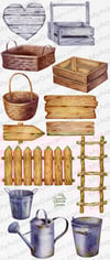 Gardening tools and old stuff: iron buckets, baskets, wooden crates, fence, wooden road-sign, wooden ladder, wooden heart