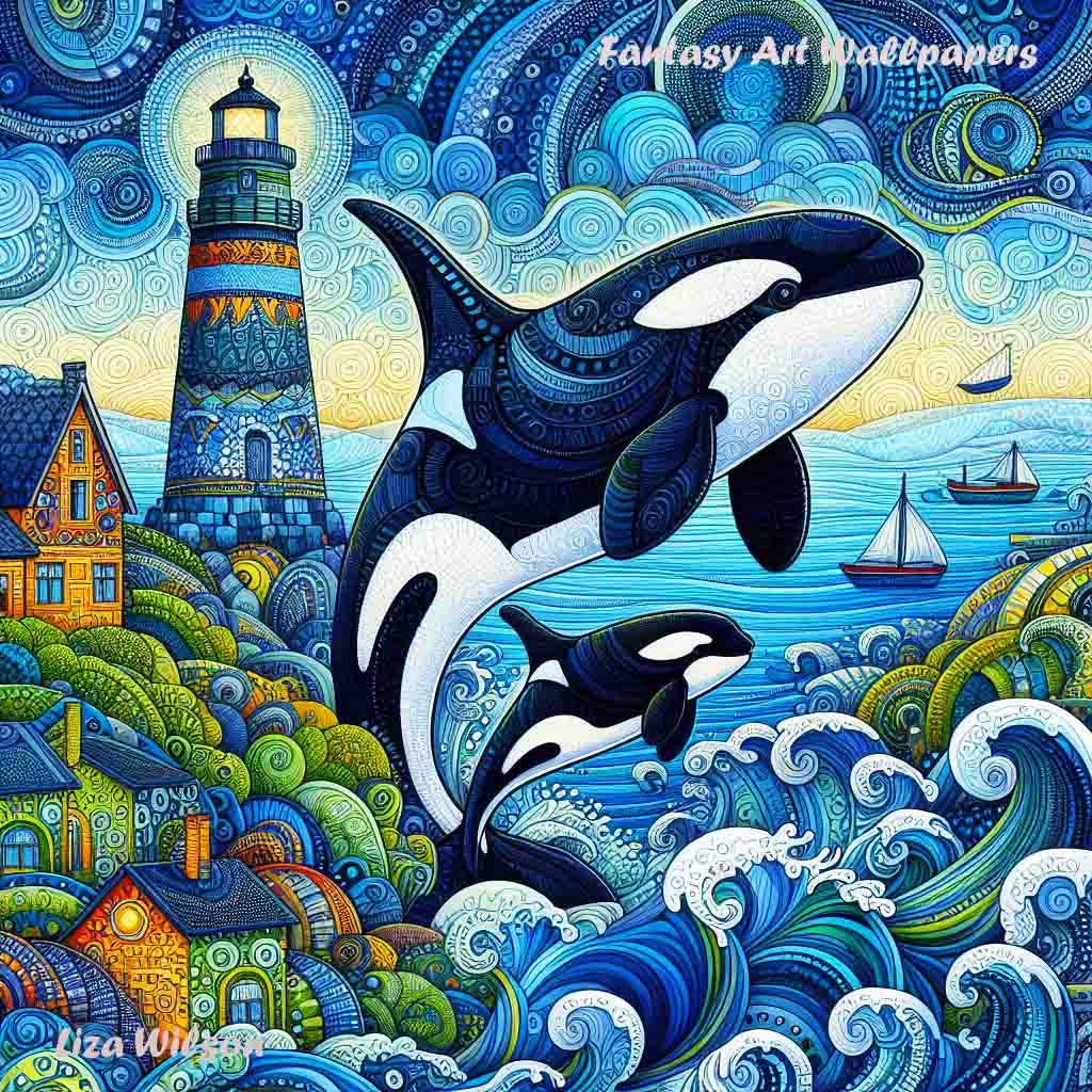 Beautiful big killer whale & baby with spirograph patterns & spirograph waves. There are ships, a lighthouse & some cliff sea houses.