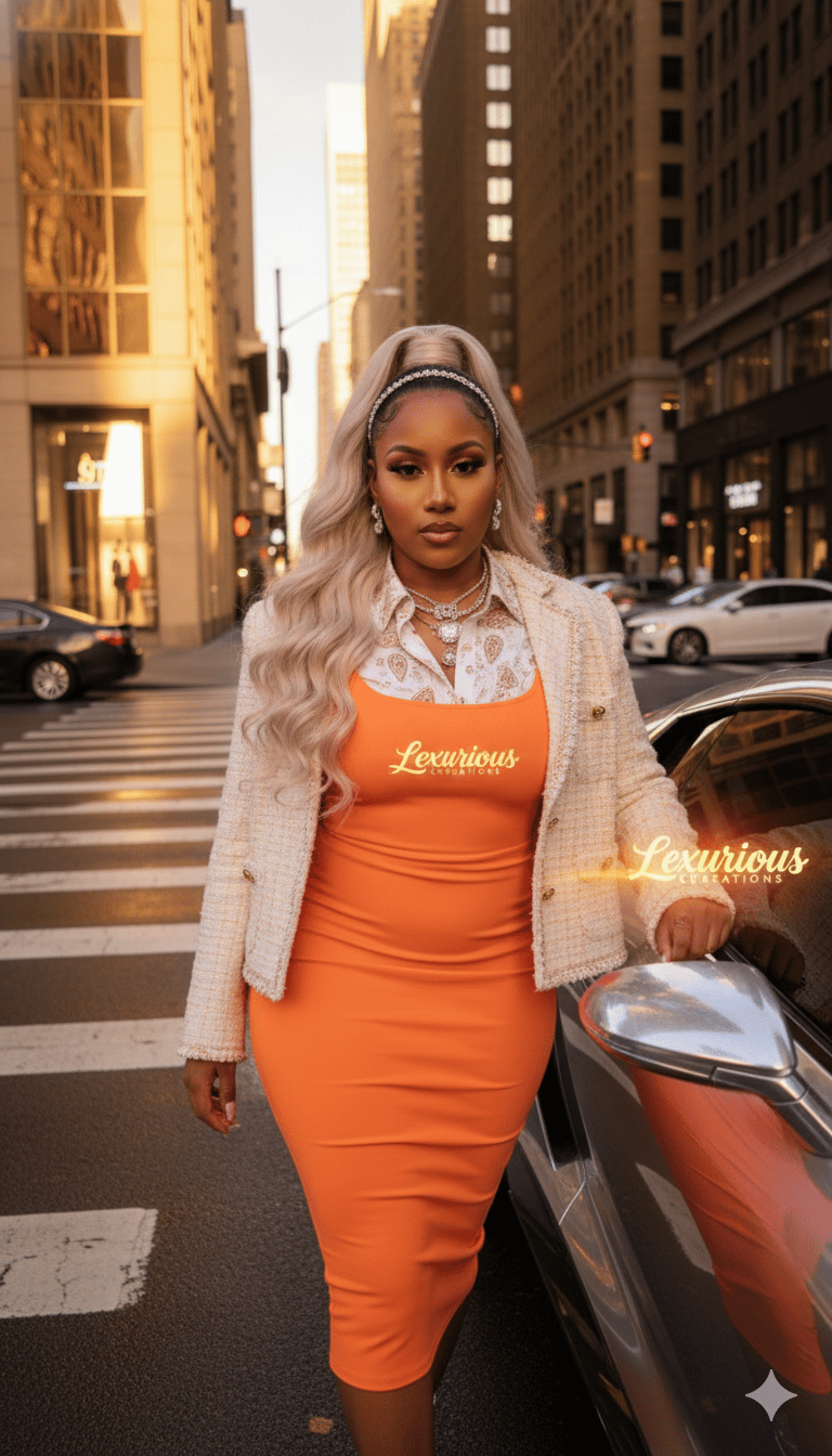 Step into pure citrus luxury with this vibrant 5-prompt fashion pack — a cinematic celebration of orange, gold, and neon heat. Each 8K scene captures high-end street glam with a luxe editorial twist — from chrome cars and golden rooftops to mirrored penthouses and neon alleys.