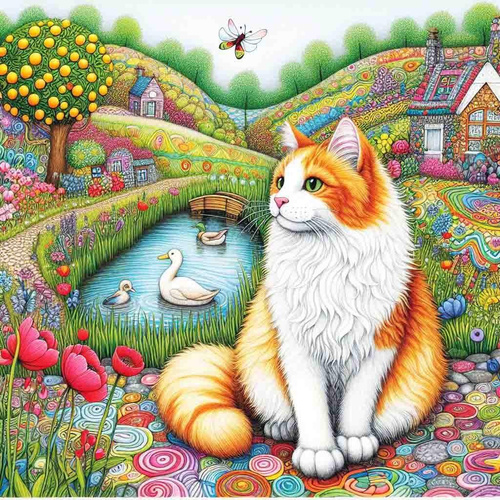 Ginger & white cat on patterned ground with trees & flowers, a cottage, pond ducks & butterflies.