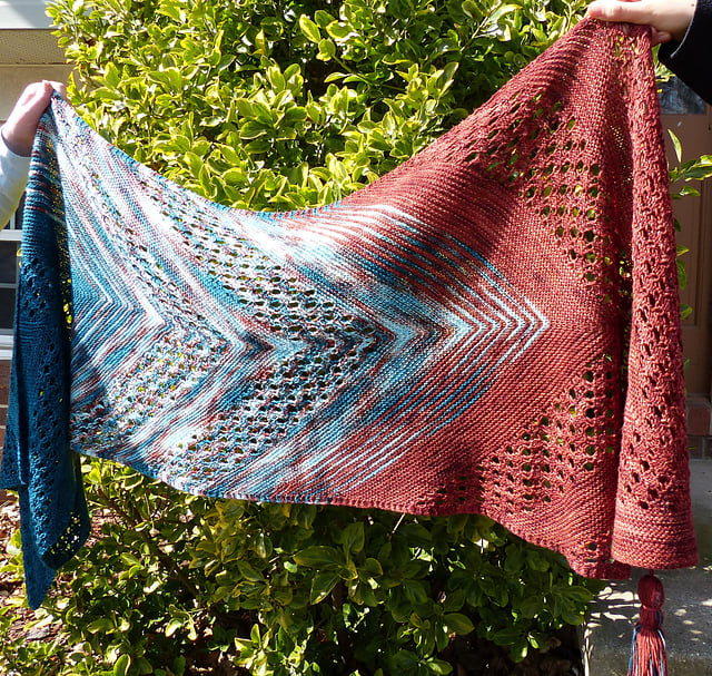 Sock Obsessions Yarn Sock weight yarn in three coordinating colors or 1200-1300 yards of similar fingering weight yarn. Solids, semi solids, tonal and variegated yarns will all work with this design! The colors used in the sample are Pumpkin in Denim, the blue that starts at the top straight edge, Sky Over Pumpkin, the yummy variegated yarn in the center, and Pumpkin in Pumpkin, that amazing orange that terminates at the tip. You will have enough yarn left to make a tassel or two if that’s your thing.