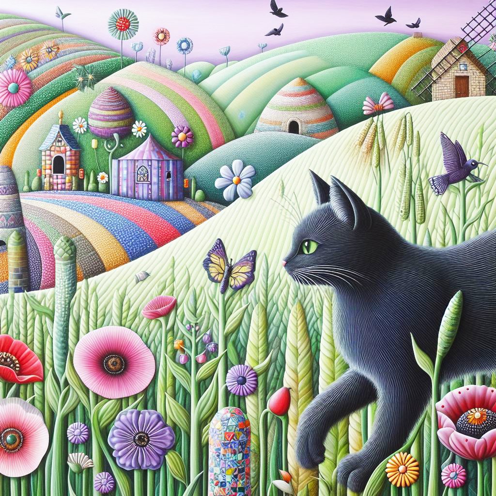 A black cat wandering through a corn field on high patterned hills with poppies, daisies, & toadstools. There are humming birds & butterflies. There is a colourful windmill & a mouse hides in a flower.