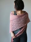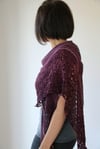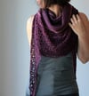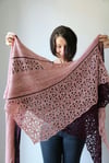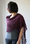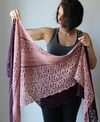 Together Apart is an asymmetrical triangle shawl knit with a garter stitch body and interspaced with sections of lace. One shawl takes two skeins of Madelinetosh Tosh Merino Light for the main color and a few grams of one of a different color for the contrast stripes.