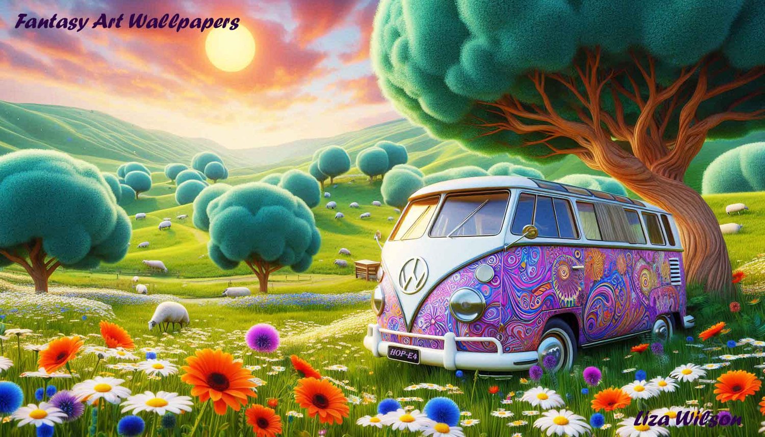 Hippie style pink campervan in a lush green field with trees & wild flowers. The sun is setting.