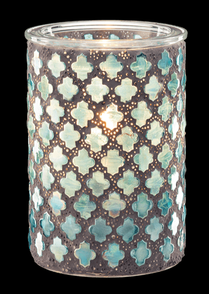 Crafted with stained-glass tiles in serene, coastal blues, the Marrakesh Warmer delivers instant ambiance. Tiny glass beads embedded in the grout transform into brilliant points of light when illuminated, creating a warm, glowing effect that feels elevated and timeless.