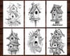 Beautiful pages include: bird houses, birds, bird houses with leaves, bird houses with flowers, tropical birds