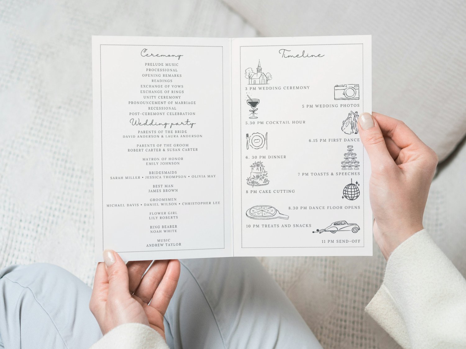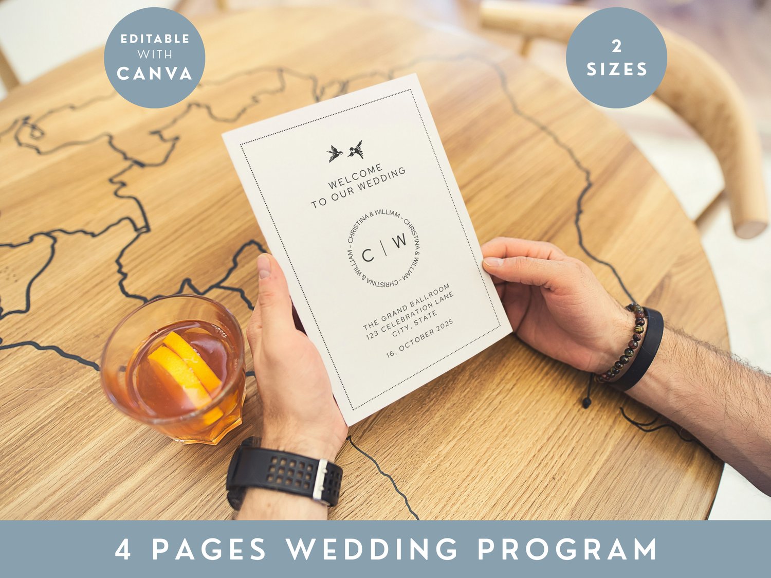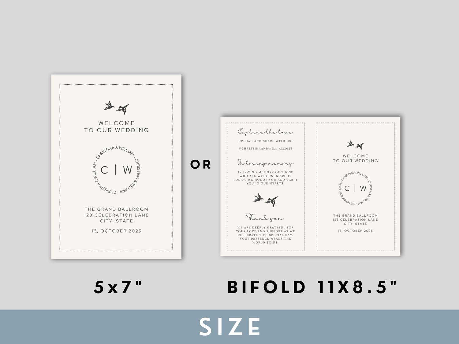 Add a touch of elegance to your ceremony with this bifold printable wedding program featuring a minimalist monogram and bird design. This editable timeline template is perfect for formal wedding events.