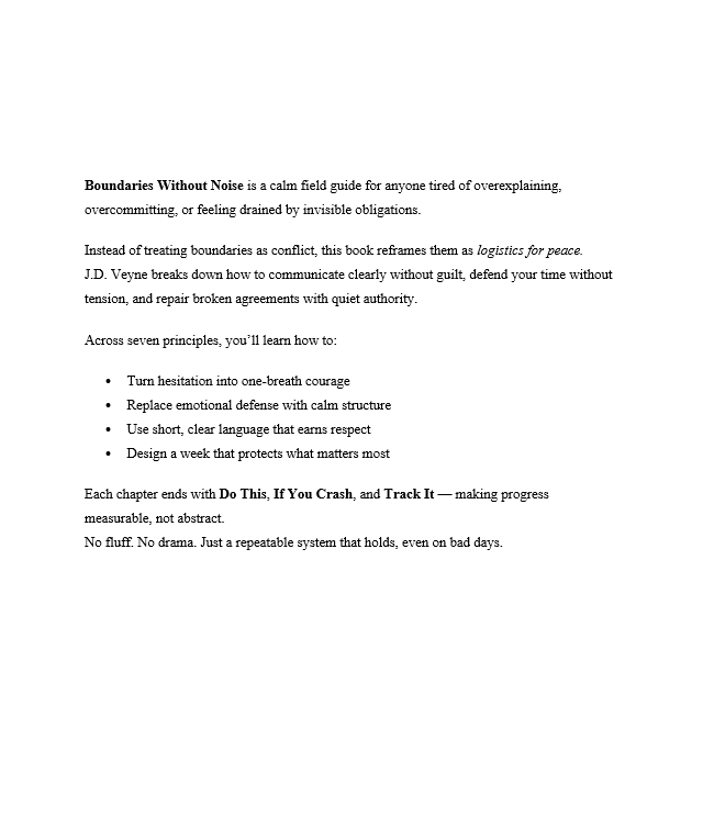 Boundaries Without Noise is a practical guide to protecting your time, focus, and energy without guilt or conflict.