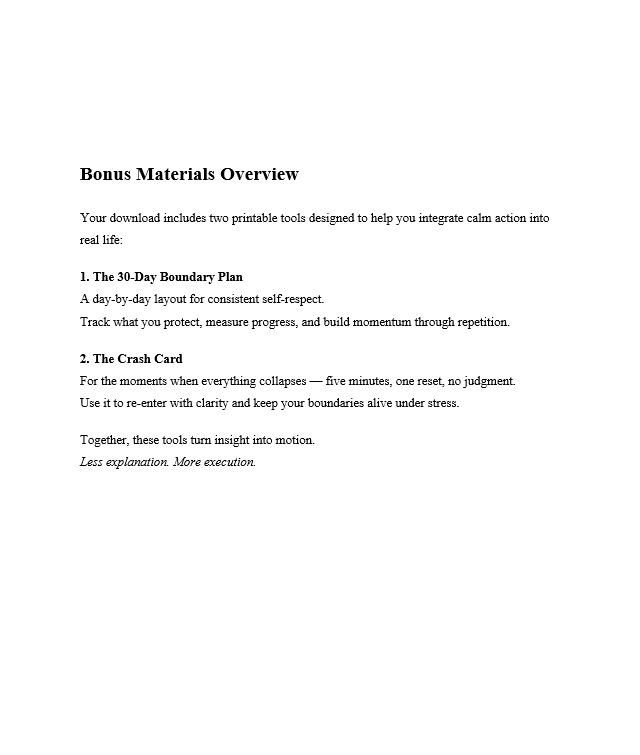 The book closes with two structured frameworks — a 30-day progression for boundary practice and a short emergency reset sequence — designed to help you turn clarity into daily rhythm.