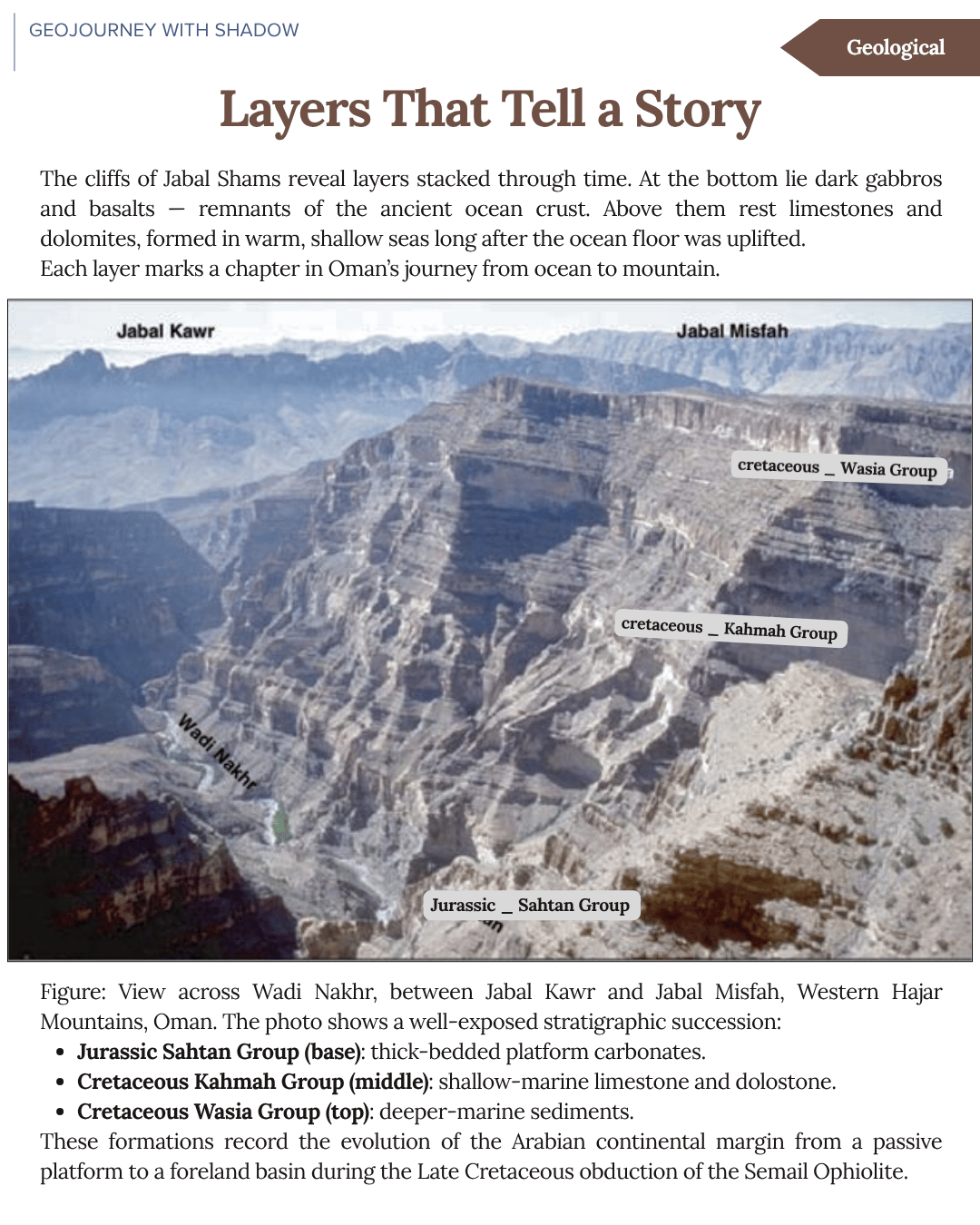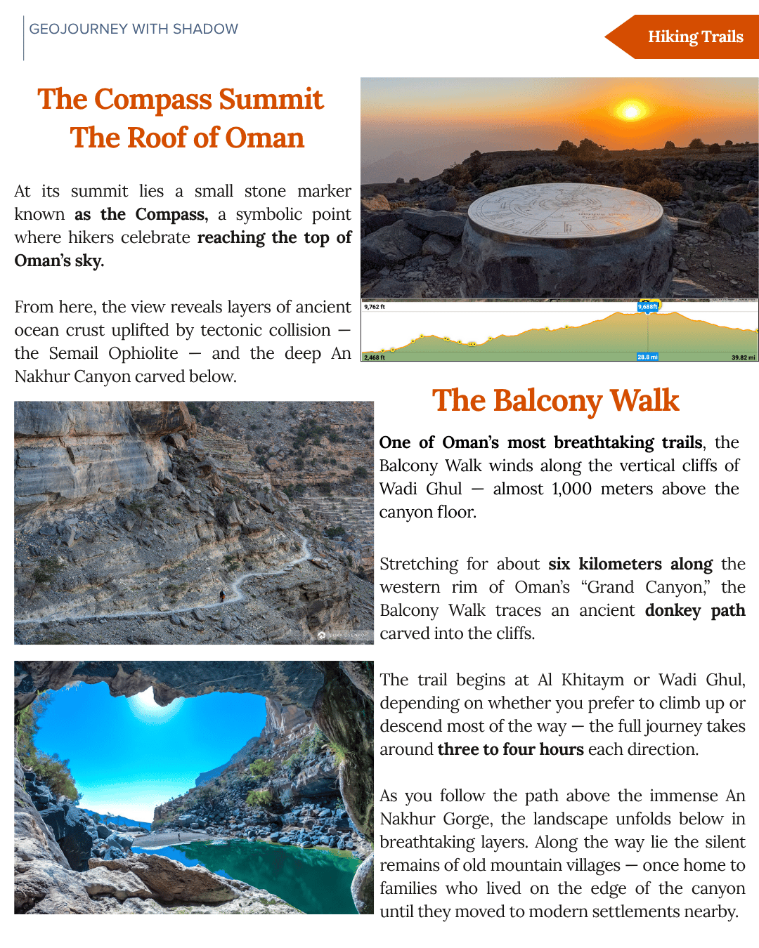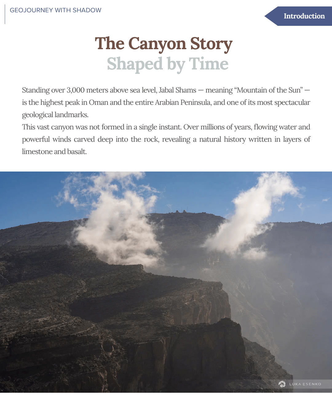 Explore Jabal Shams, Oman’s highest peak, through an 8-page illustrated guide designed for geologists, hikers, and curious minds alike.