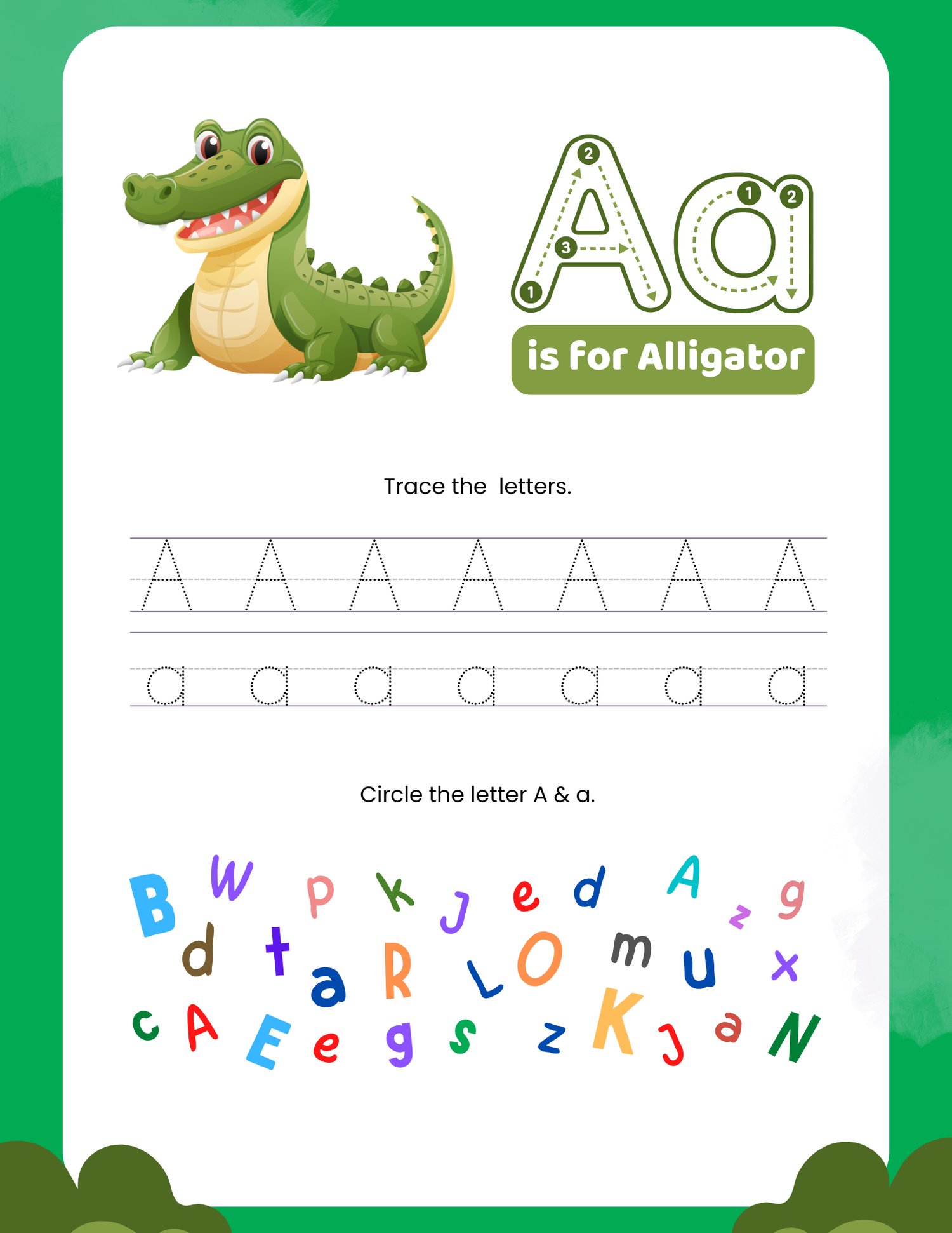 • 1 alphabet learning page (Letter A)