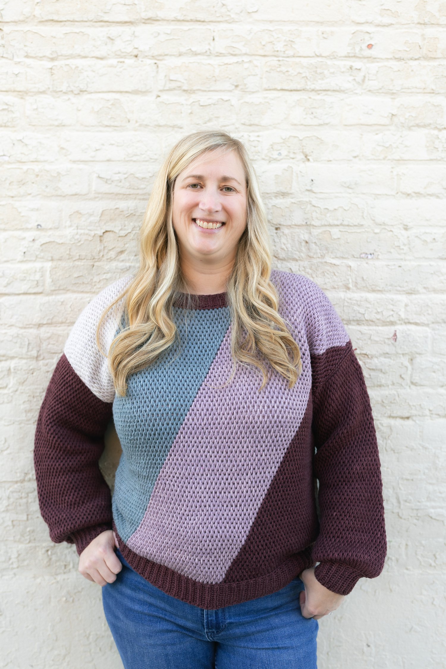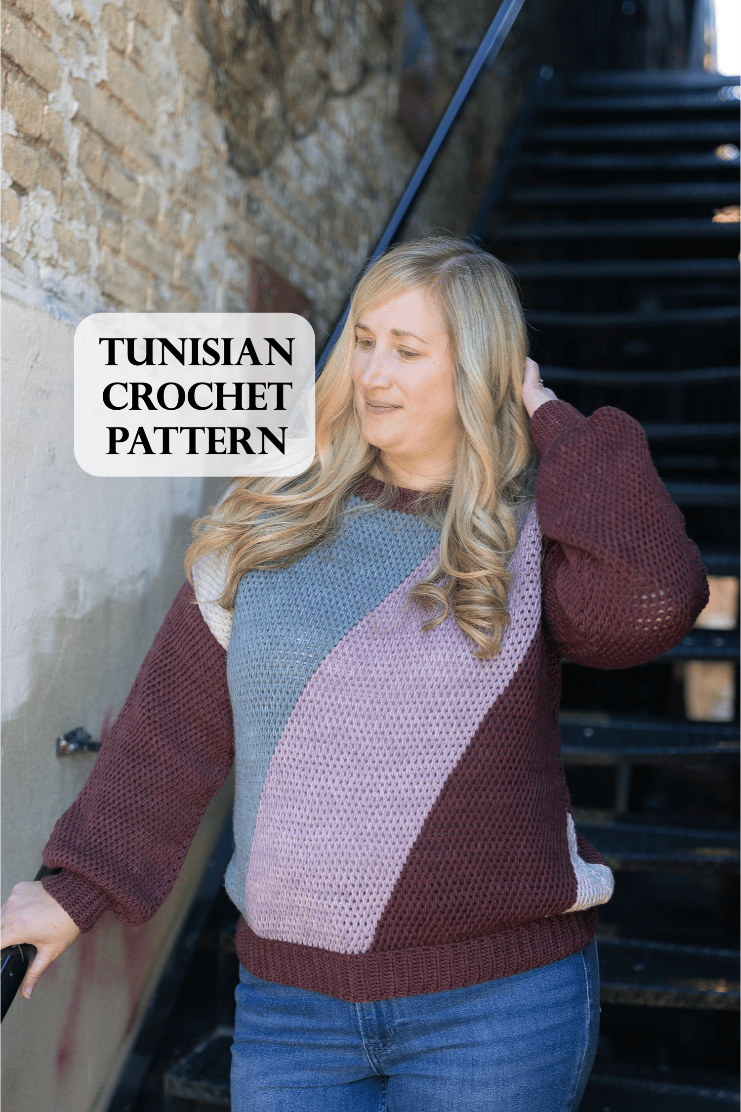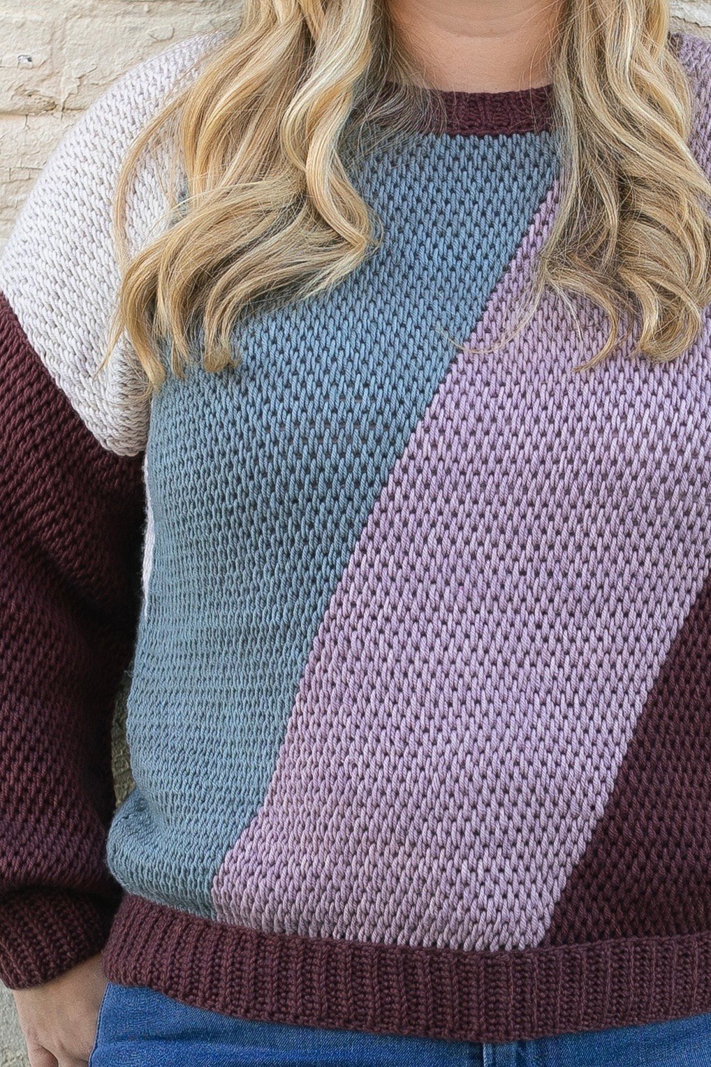 The Oblique Sweater is a top-down, four-color Tunisian crochet sweater that celebrates geometry, texture, and color. Inspired by the clean angles of an oblique rectangular prism, this DK-weight design features bold diagonal color blocks that flow seamlessly across the body and sleeves.