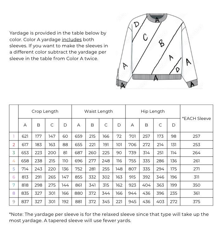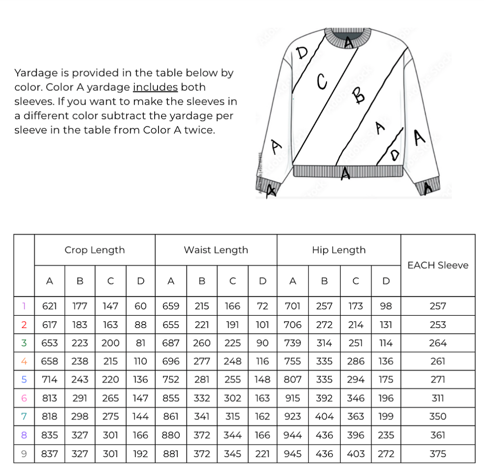 Pattern provides instructions for sizes 1 - 9. The sweater is designed with 4 - 6 in positive ease. See photos for size chart.