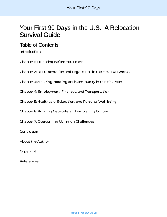 "Your First 90 Days" is your essential roadmap for navigating the challenges of relocating to the United States. With practical checklists, insider tips, and success strategies, this guide breaks down the critical first three months into manageable stages, ensuring you transition smoothly from visitor to resident. Equip yourself with the knowledge and resources to build a fulfilling life in your new community.