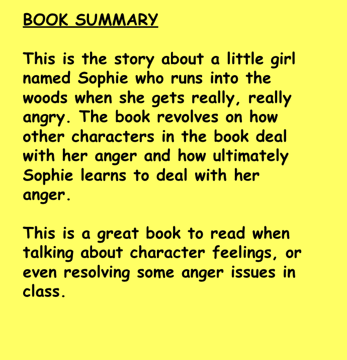 Overall, the teacher's guide for "When Sophie Gets Angry -- Really, Really Angry" provides a valuable opportunity for children to learn about and manage their emotions in a safe and supportive environment.