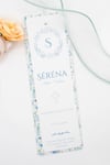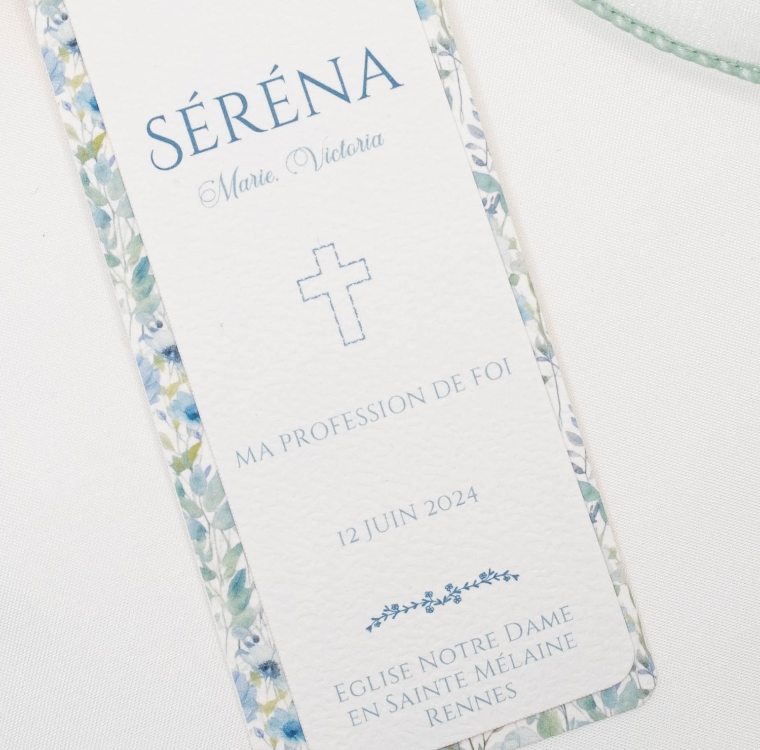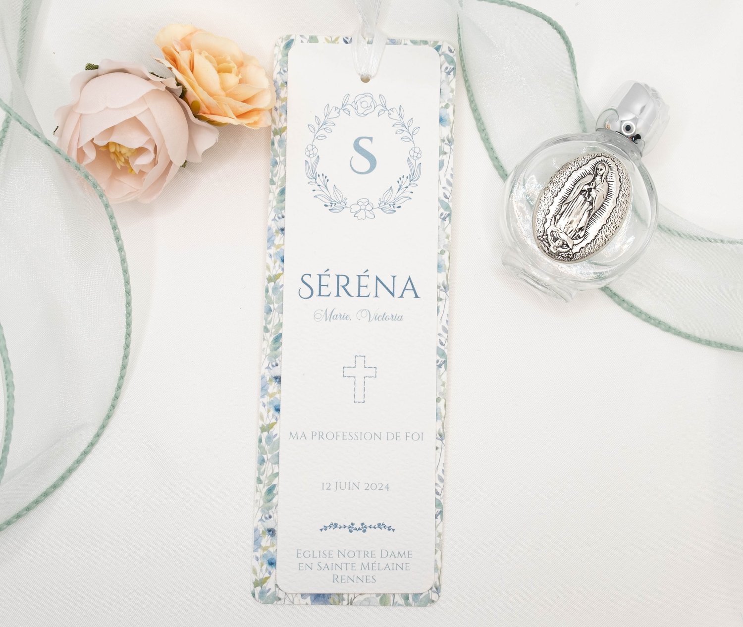 Son fond fleuri, aux nuances bleu et vert d’eau, évoque la fraîcheur et l’innocence. Sur le volet supérieur, l’initiale de l’enfant est entourée d’une couronne végétale délicate. En dessous, le prénom (et s’il y a lieu, les seconds et troisièmes prénoms) sont soigneusement inscrits, accompagnés d’une petite croix, ainsi que la date et le lieu de l’événement, et le texte de votre choix.