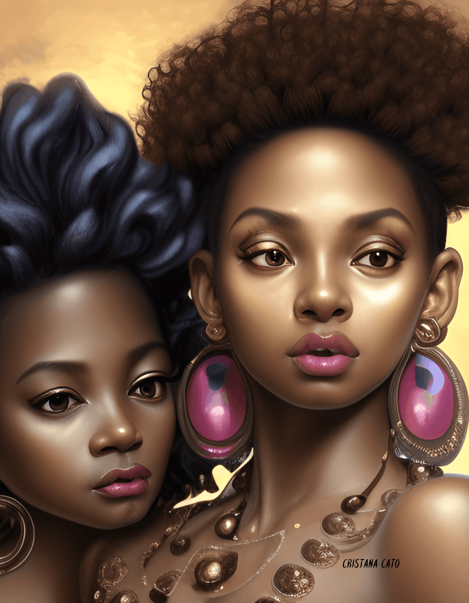This captivating digital artwork, “Majestic Glow,” features a striking figure adorned with voluminous curls and large hoop earrings. The subject’s hair is a beautiful blend of natural curls on top and sleek, straightened sides, creating a dynamic and elegant look. The individual wears a necklace made of multiple round elements, resembling coins or medallions, adding a touch of regal sophistication.