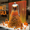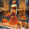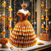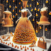A breathtaking blend of high fashion and playful sweetness, this couture gown is composed of vibrant candy corn, artfully arranged to create a bold, sculpted masterpiece. Complete with matching candy corn accessories, this look turns a seasonal treat into a daringly elegant statement for the fashion-forward.