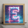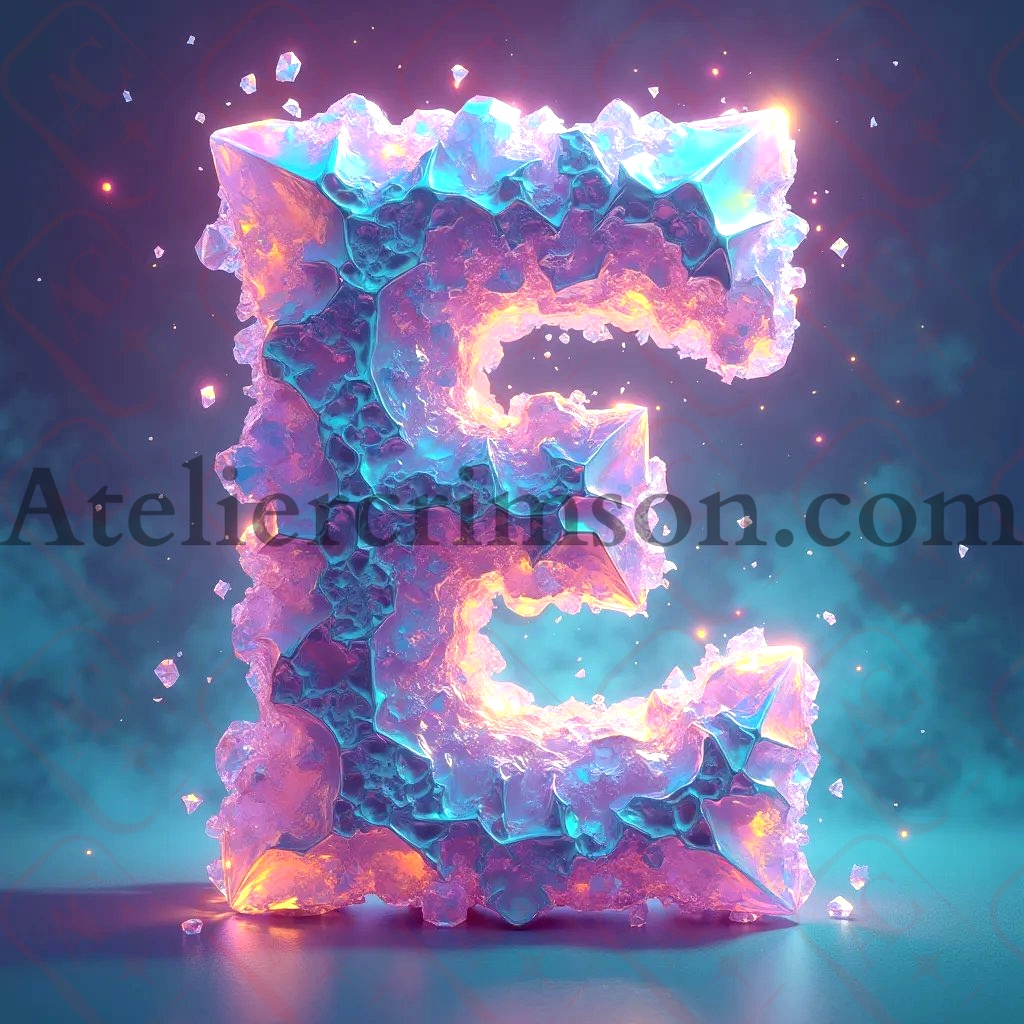 The letter E crystalline Retro Futuristic C A unique creation blending retro-futuristic aesthetics and geometric elegance. Each character is sculpted from iridescent crystals in vibrant, nostalgic hues, set in delicate silver filigree. Against a gradient background transitioning from deep purple to teal blue, this digital artwork captures the essence of 80s-inspired digital art with a touch of crystalline luxury. Perfect for typography enthusiasts, digital art lovers, and those who appreciate retro-futuristic aesthetics.