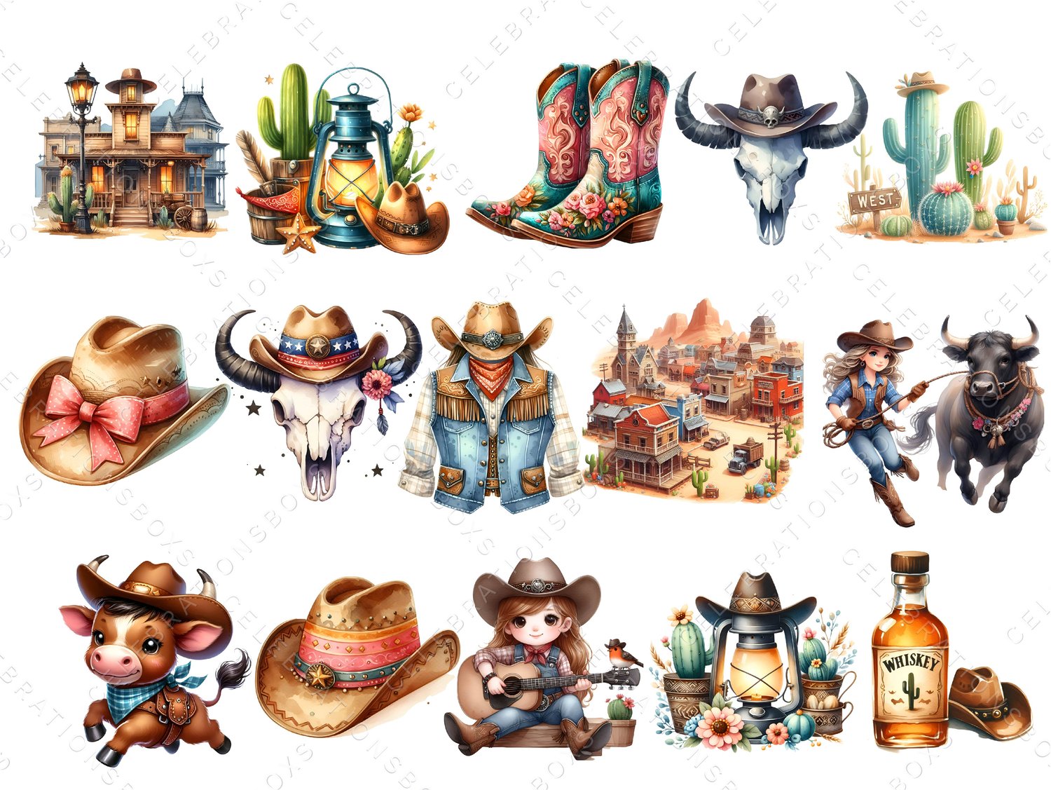 This Cute Cowgirl Clipart bundle has Wild West Clipart, Desert Clipart, toys, Farm Clipart, Cactus Clipart, cowgirl boots, cowgirl hats, Wild West Clipart, baby boots and more! It's a great Western themed collection that's perfect for Baby boy Shower and Baby Birthdays. These illustrations will help you create stunning baby invitations, cute gifts for your loved ones and relatives, posters, scrapbook, albums, greeting cards, stickers, mood boards, social networking and promotions, packaging, covers, cases, and more.