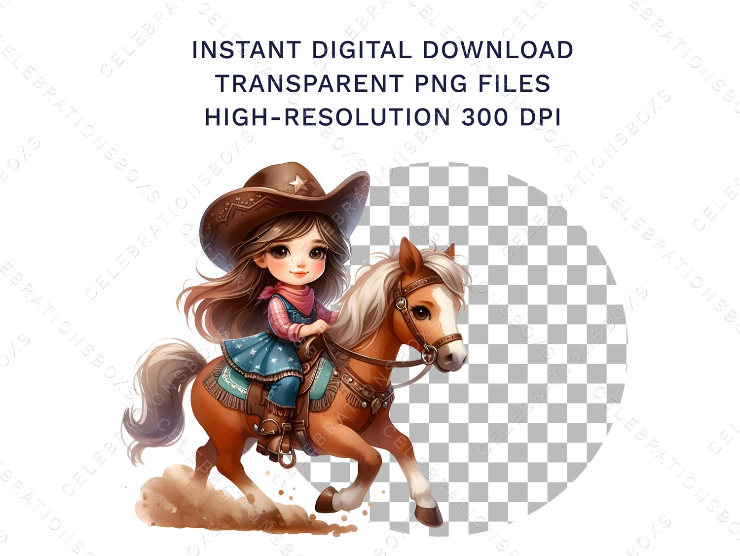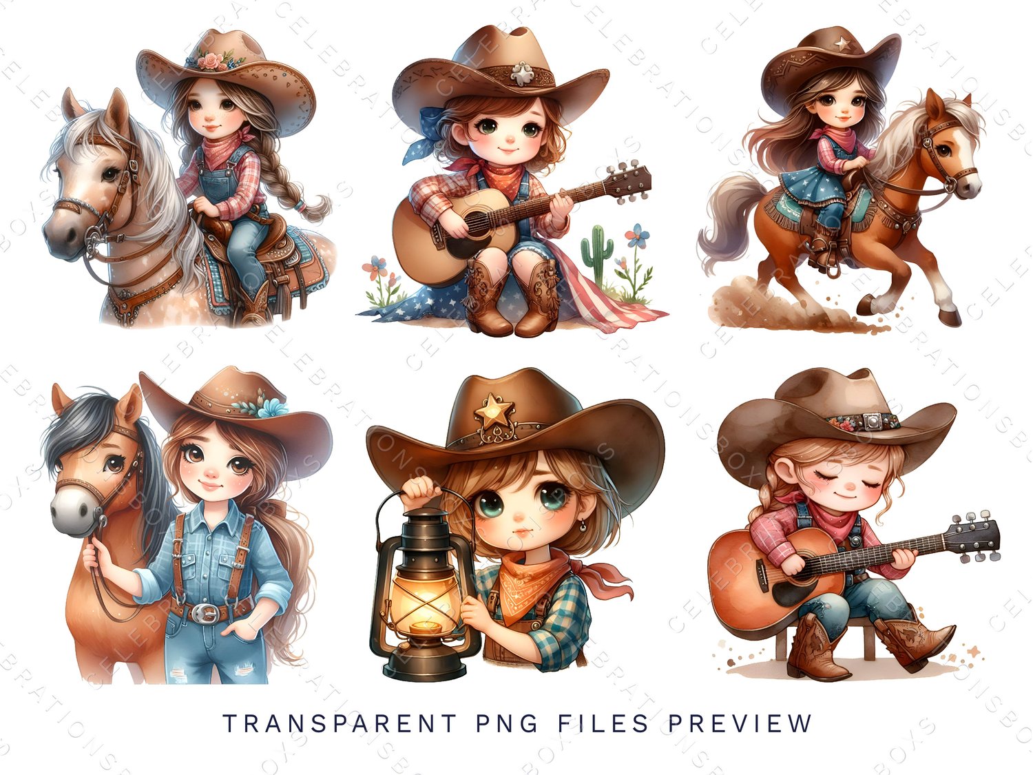 This high quality watercolor Baby Cowgirl Clipart is easy to print and Perfect for greeting cards, party decorations, mug sublimation, t-shirt sublimation, invitation cards, cupcake toppers, junk journaling, stickers, scrapbooking, stationary, gift warp, embroidery, printed fabrics, poster, banner and so much more!