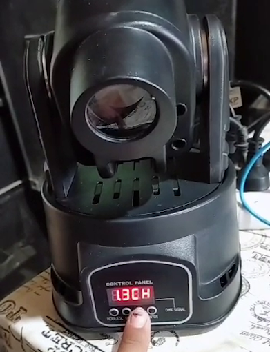 * En el modo de 13CH Verifique, con un Fixture de pruebas (click), que coincidan estos canales: 1 Pan, 3 Tilt, 6 Dimmer / Strobo, 9 Blue.