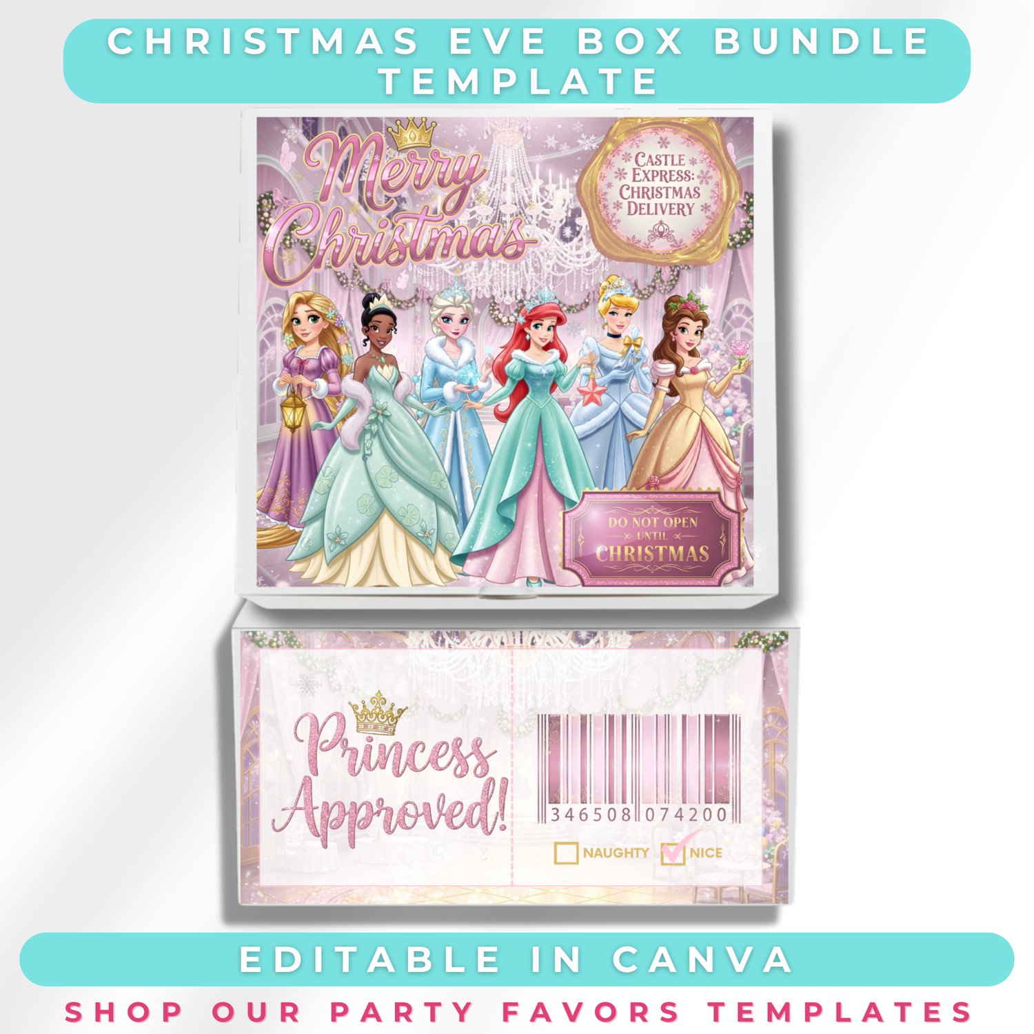 Create the ultimate magical Christmas Eve experience with this Princess Christmas Eve Box Template Bundle, fully editable in Canva and perfect for crafters, moms, party planners, and small businesses!