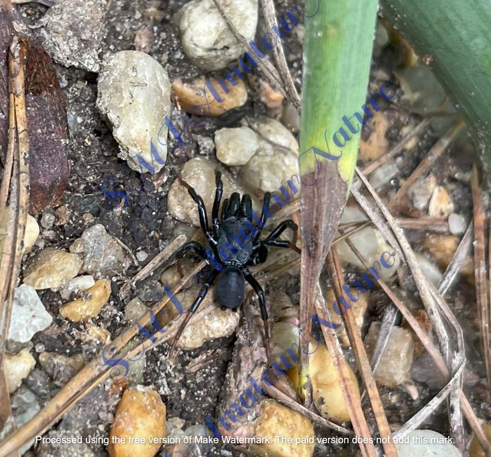 Amateur photograph of a Trapdoor spider (Family: Ctenizidae) as it hunts for prey, or perhaps a new home. Trapdoor spiders are spiders that lie in wait for prey to wander to close to their homes. Then they pop out of the little doors they make to surprise their dinners. Image taken in Virginia, USA. Image pixels 1176x1096. Can be easily resized to suit buyer needs. Purchase gives image without any watermark.