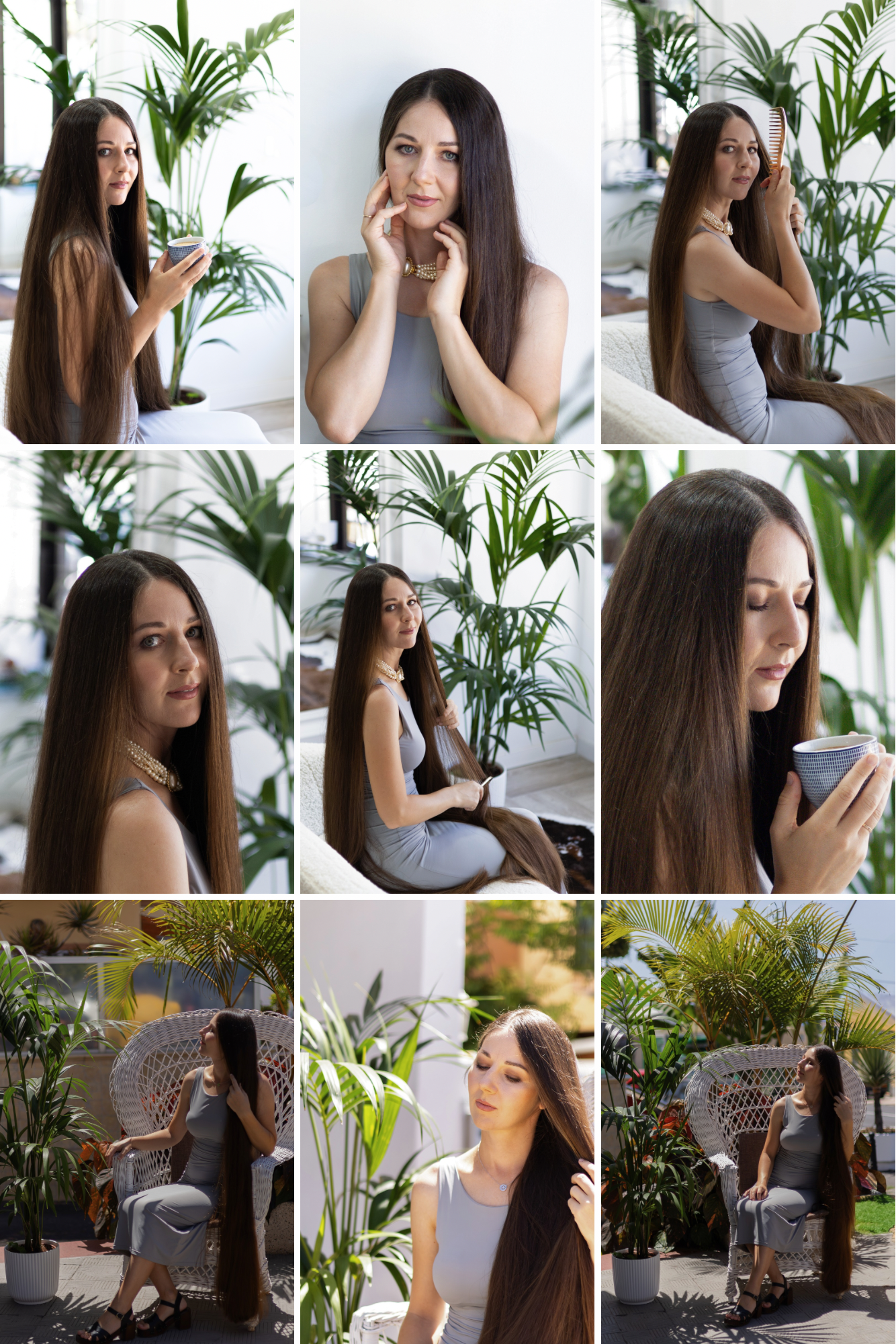The collection contains a mix of indoor photos shot in natural light and bright outdoor images in direct sunlight. The set includes both full-length hair views and portrait shots, making it useful for visual reference.