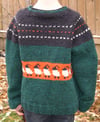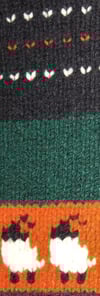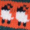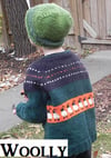 Knit in 4 colors from the bottom up in the round, this design uses stranded knitting, written instructions and color charts, but never with more than two colors at a time. The sweater is completely reversible. If the kid spills on the front, as kids do…turn it around. It requires virtually no sewing at the end, just weaving in ends and joining up the underarm stitches. Woolly uses an Aran weight yarn that knits at 15 sts = 4”/10 cm after blocking on a size US 8 needle. This pattern requires the knitter to increase, decrease, knit with two colors at a time and follow a color chart, with additional written instructions for accessibility purposes.