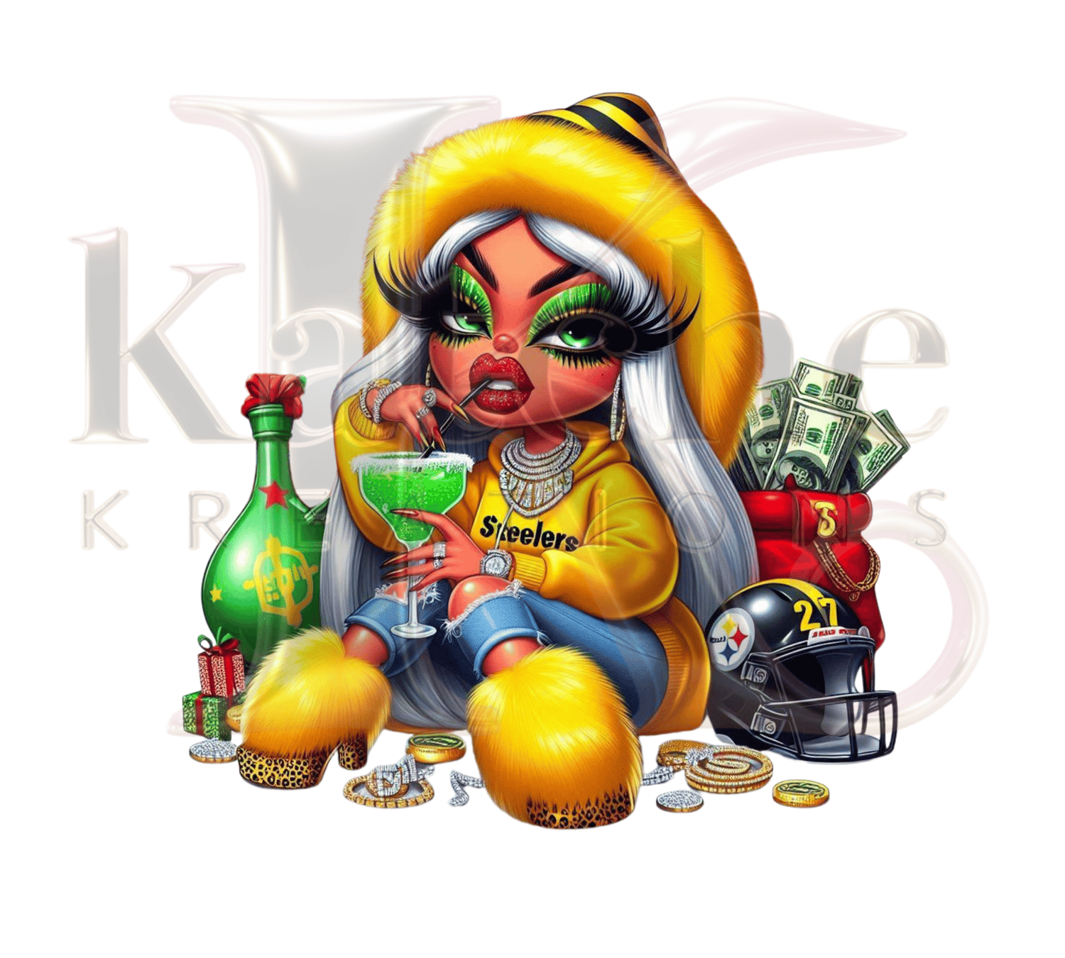 Add some elegance to the season with this “Girl Steelers”—a stunning twist on holiday style with her shimmering fur-lined coat, glamorous jewelry, and a look that says she's here to sleigh! Holding bright ornaments with a mischievous grin, she’s perfect for anyone looking to add a bit of cool glamour to their Christmas decor.