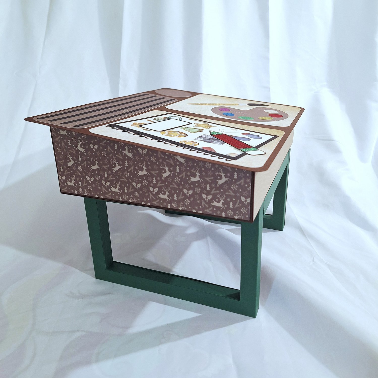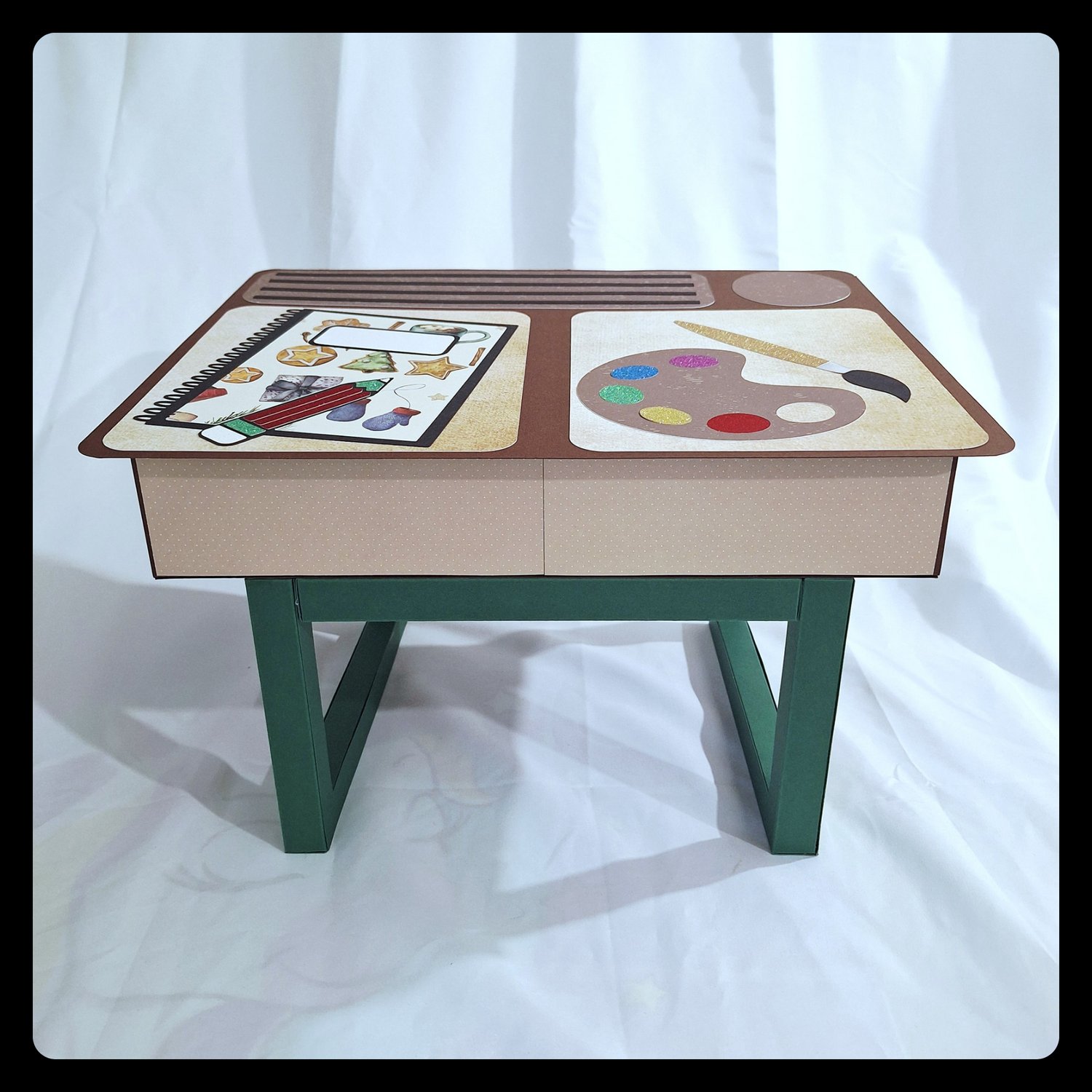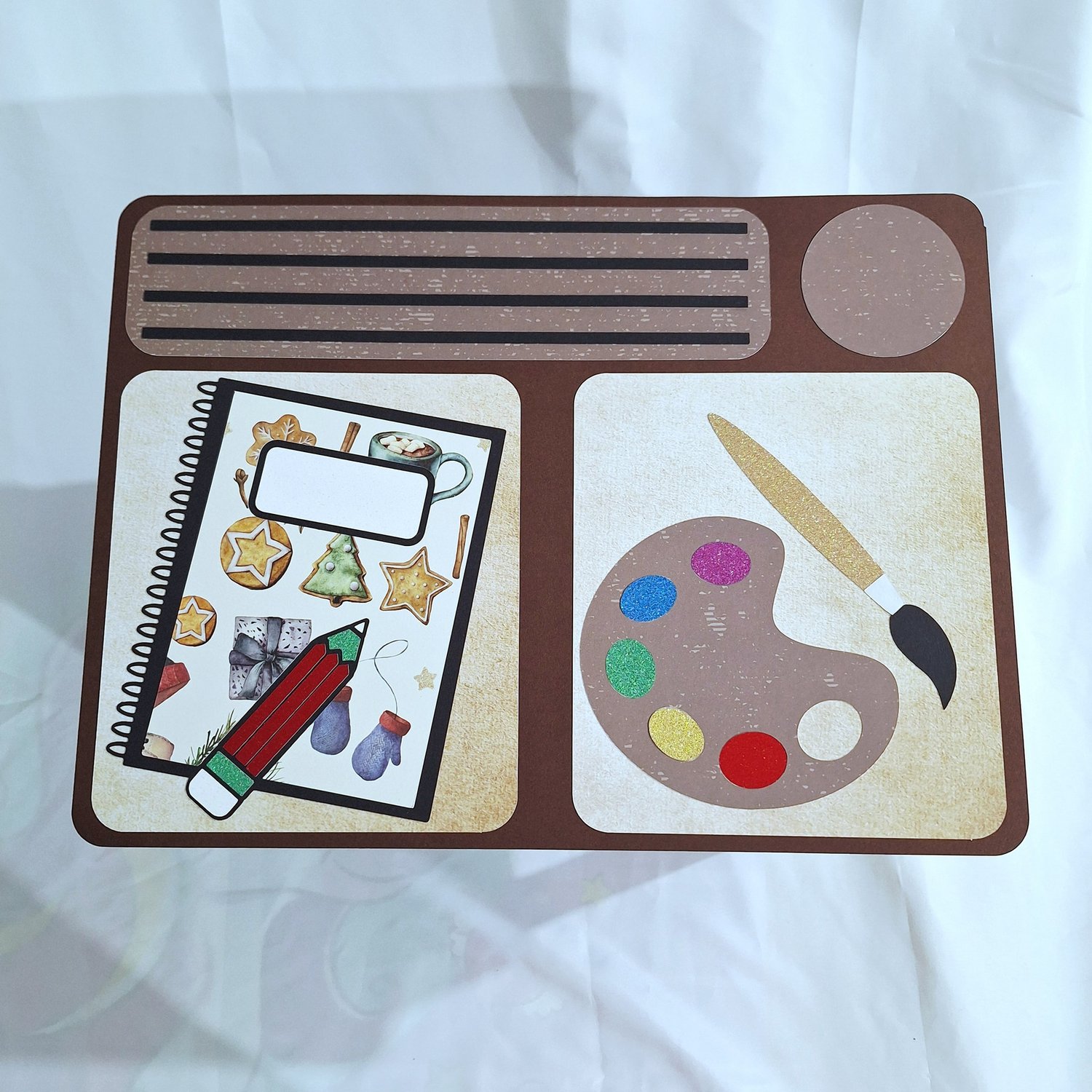📌 Pour ce projet j’ai utilisé environ 3 feuilles A3 noires, 4/5 feuilles A3 vertes, 3/4 feuilles A3 marrons, 12 feuilles 30x30 à motifs pour les boites et 6/7 feuilles 30x30 à motifs pour les décors, 1 feuille A4 kraft pour les nombres et des chutes de papiers pailletés pour le crayon et l’étiquette du cahier.